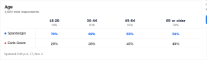 First, even though Spanberger ran as a moderate Democrat stressing bipartisanship, she captured her biggest share of votes from the youngest voters. Indeed, her support was strongly (and inversely) correlated with voter age.